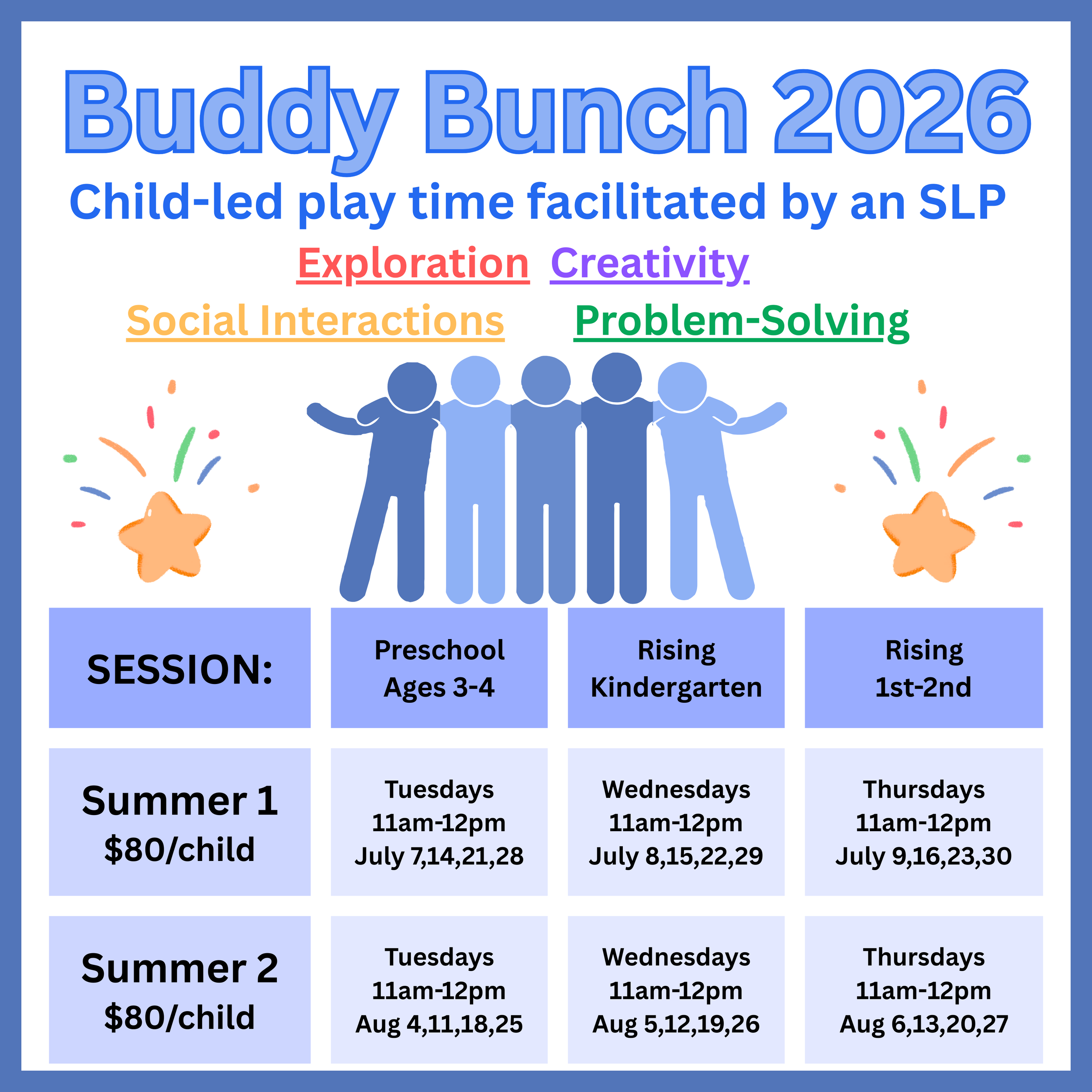 To register for a communication group, complete the form below. Select the class & age/grade level you want to attend (Toddler Sign, Buddy Bunch, or Game Group) along with the session you prefer (Summer 1 or Summer 2) . After clicking “Submit,” you will be redirected to the payment page. Please complete a new registration for each child, class, and session.